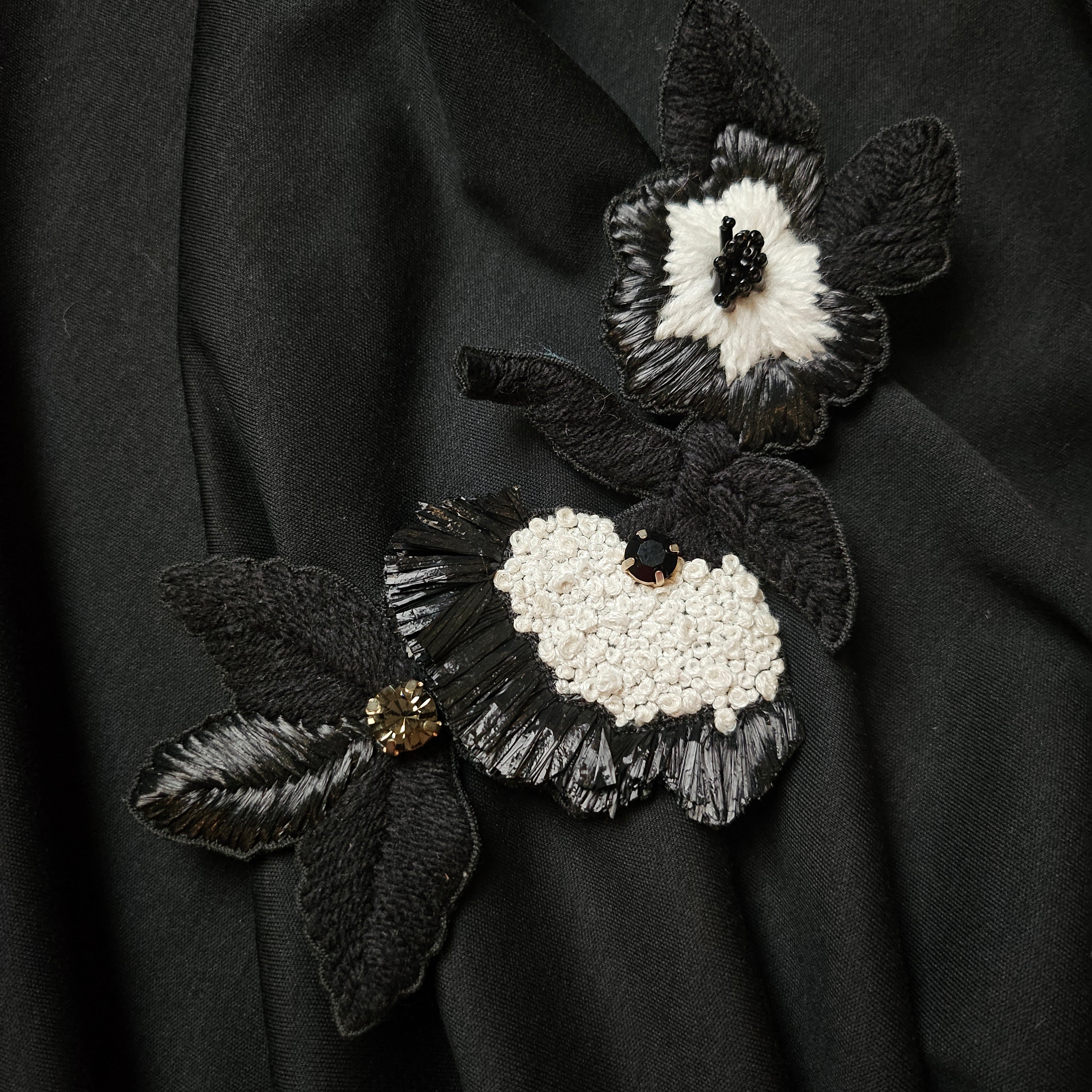 L5X3X012 Patch 3D Stickerei Wolle, Raffia, Kristalle schwarz Weiß Blume 3d D&G 15cm X 8,5cm