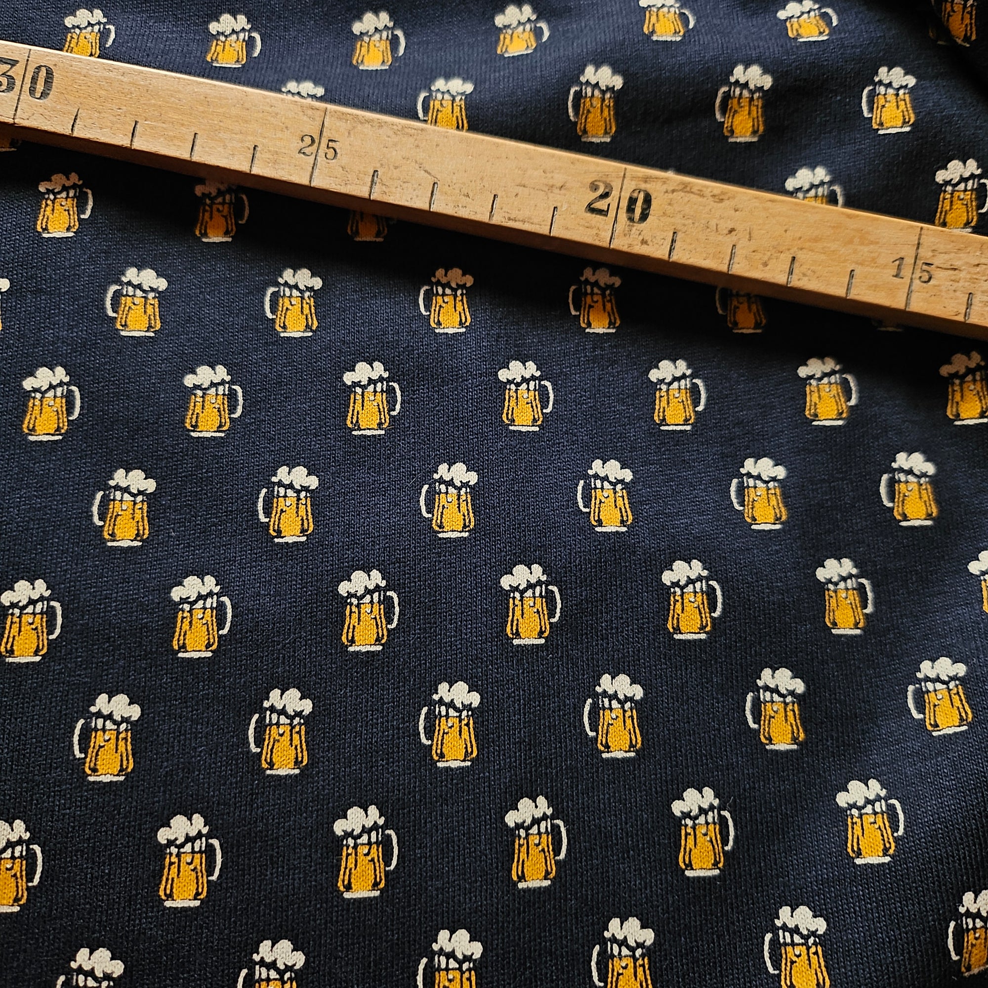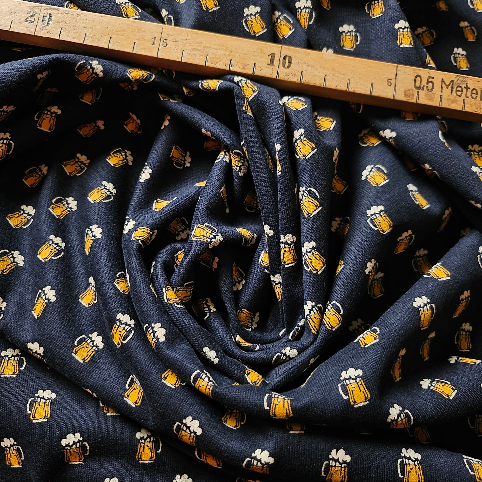 Designerstoff – Deadstock Jersey Dunkelblaues Bier-Illustration mit Gläsern | 140 cm | M1X4X17