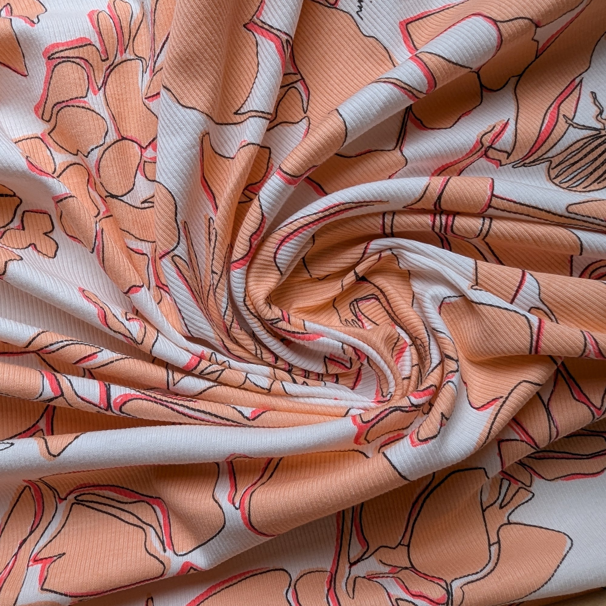 M*rc C*in Designerstoff – Deadstock Feinrippjersey Weiß mit Carnelianfarbenen Blüten | 135 cm | M2X1X8