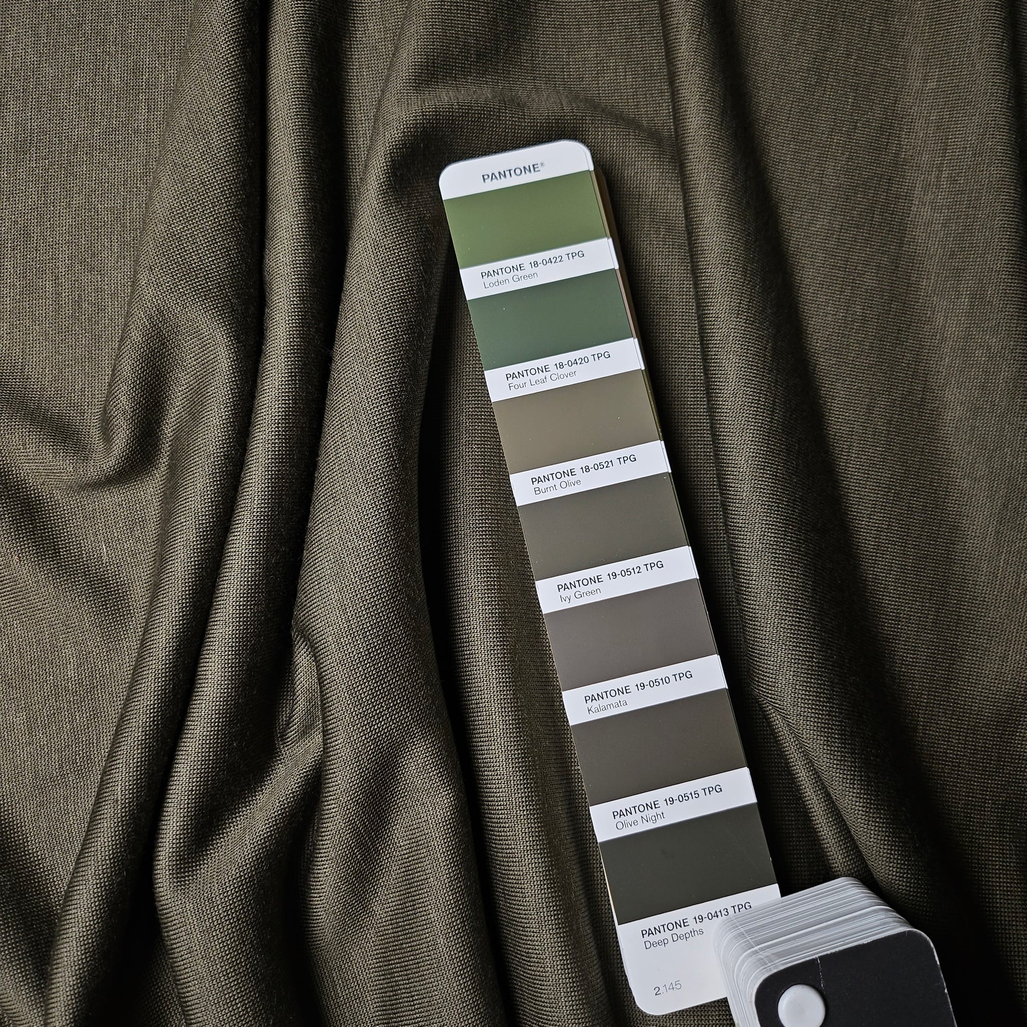 F*nd* Designerstoff – Deadstock Wolljersey in Basisfarbe Pantone Olive Night | 190 cm | M1X5X4