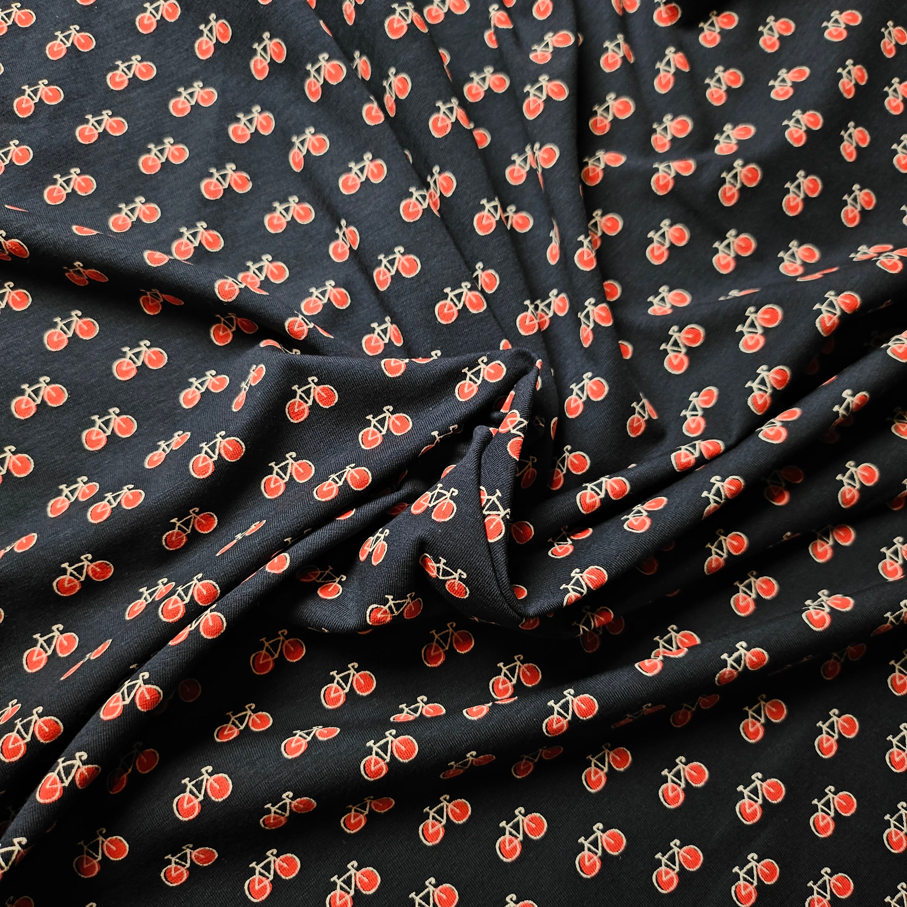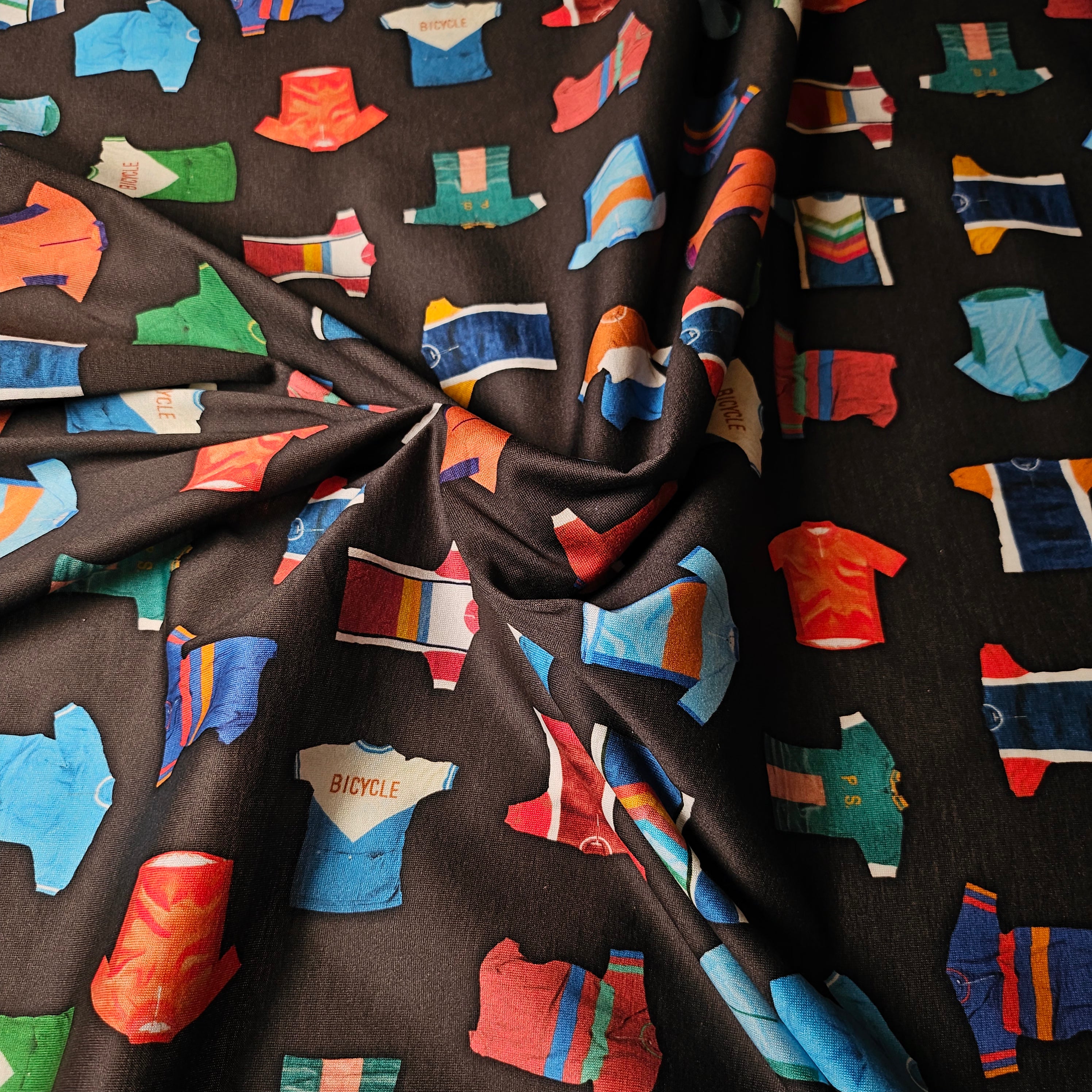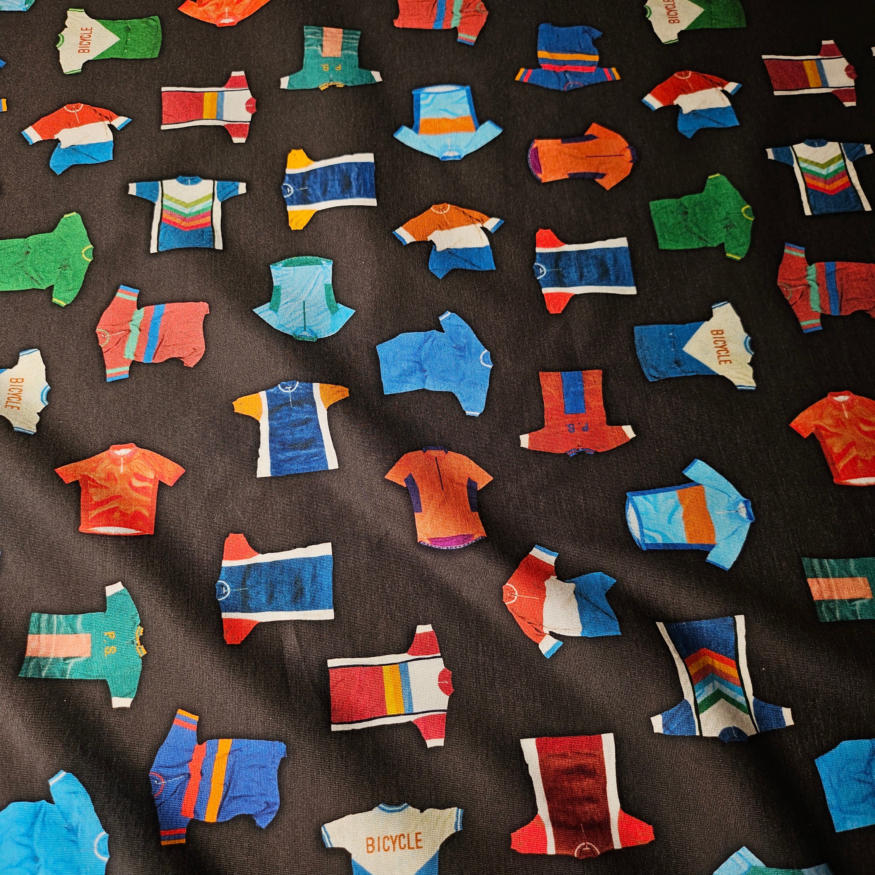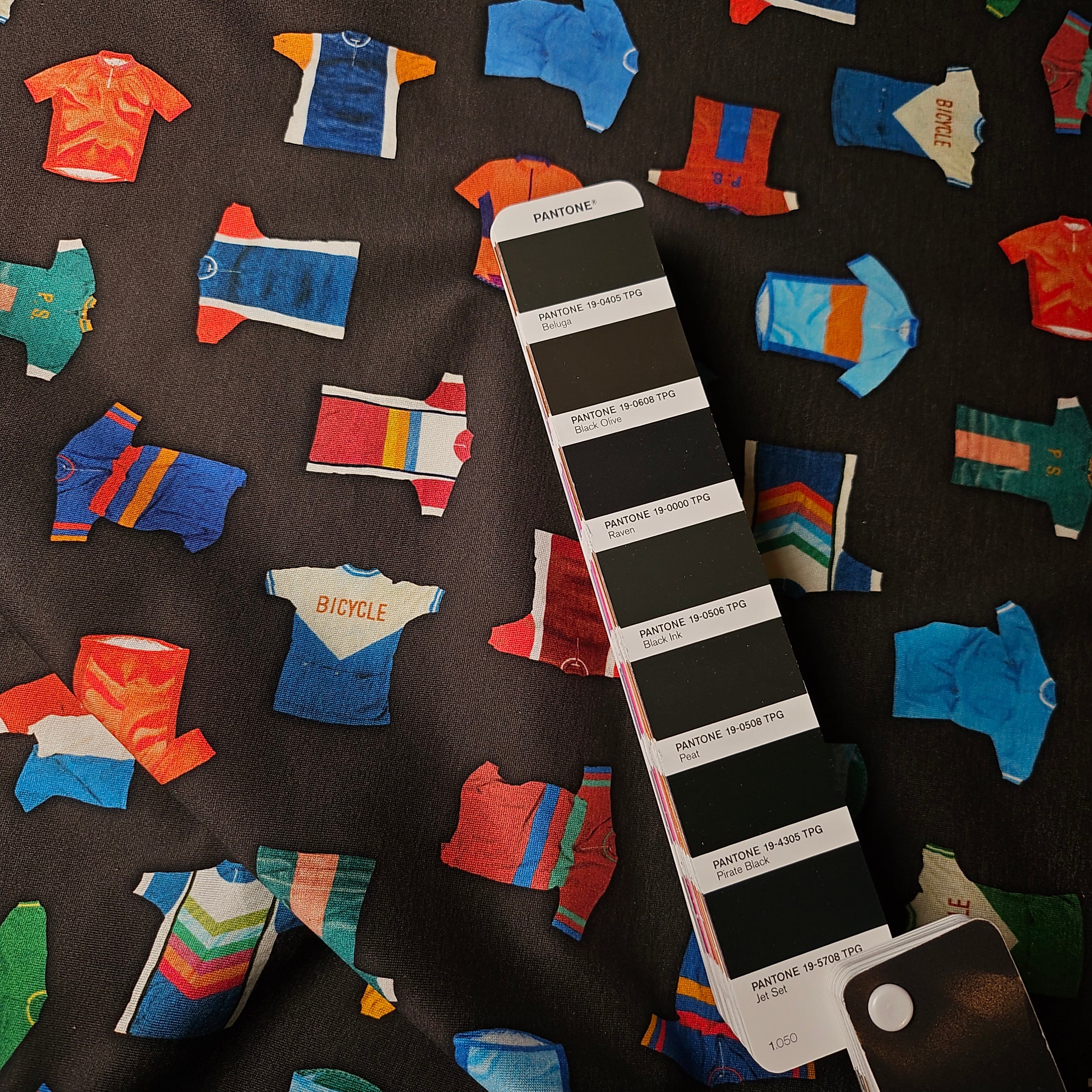 Designerstoff – Deadstock Baumwolljersey mit Radtrikot-Motiv in Basisfarbe Pantone Beluga | 135 cm | M5X5X19