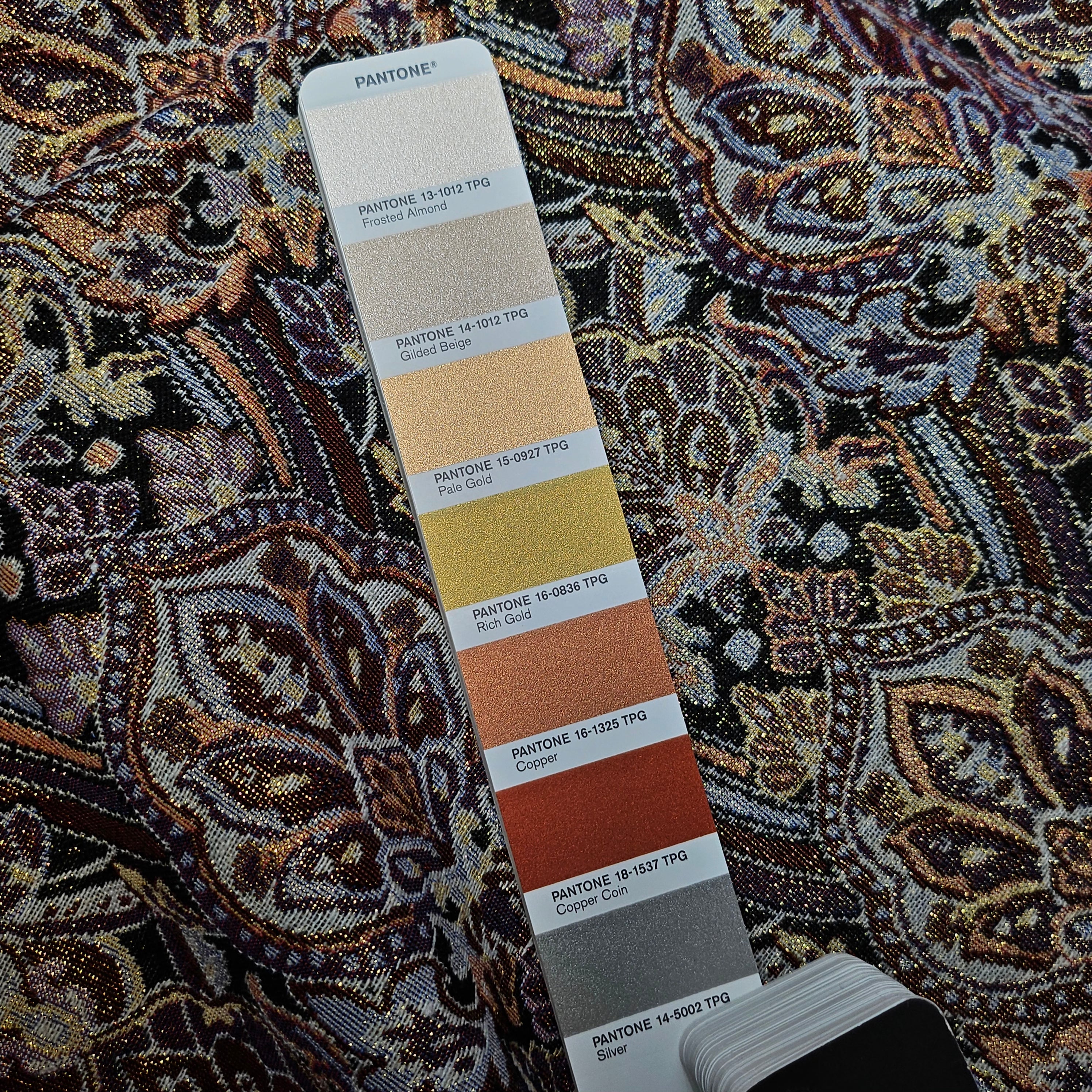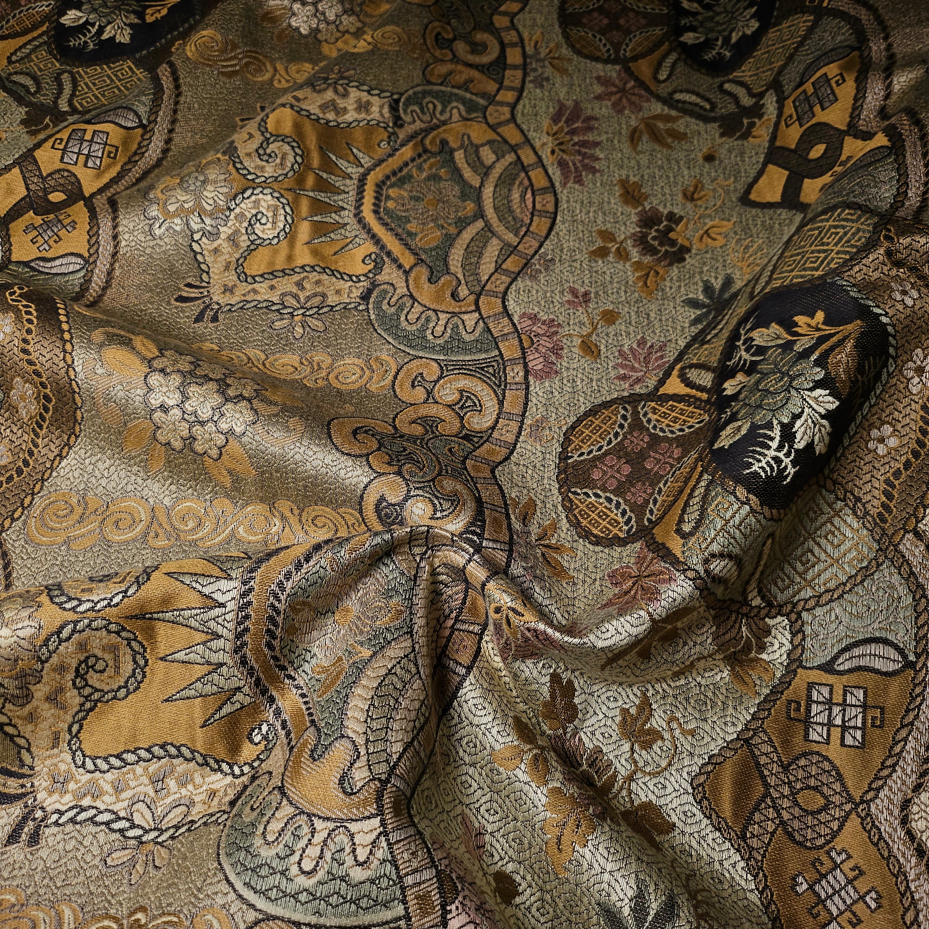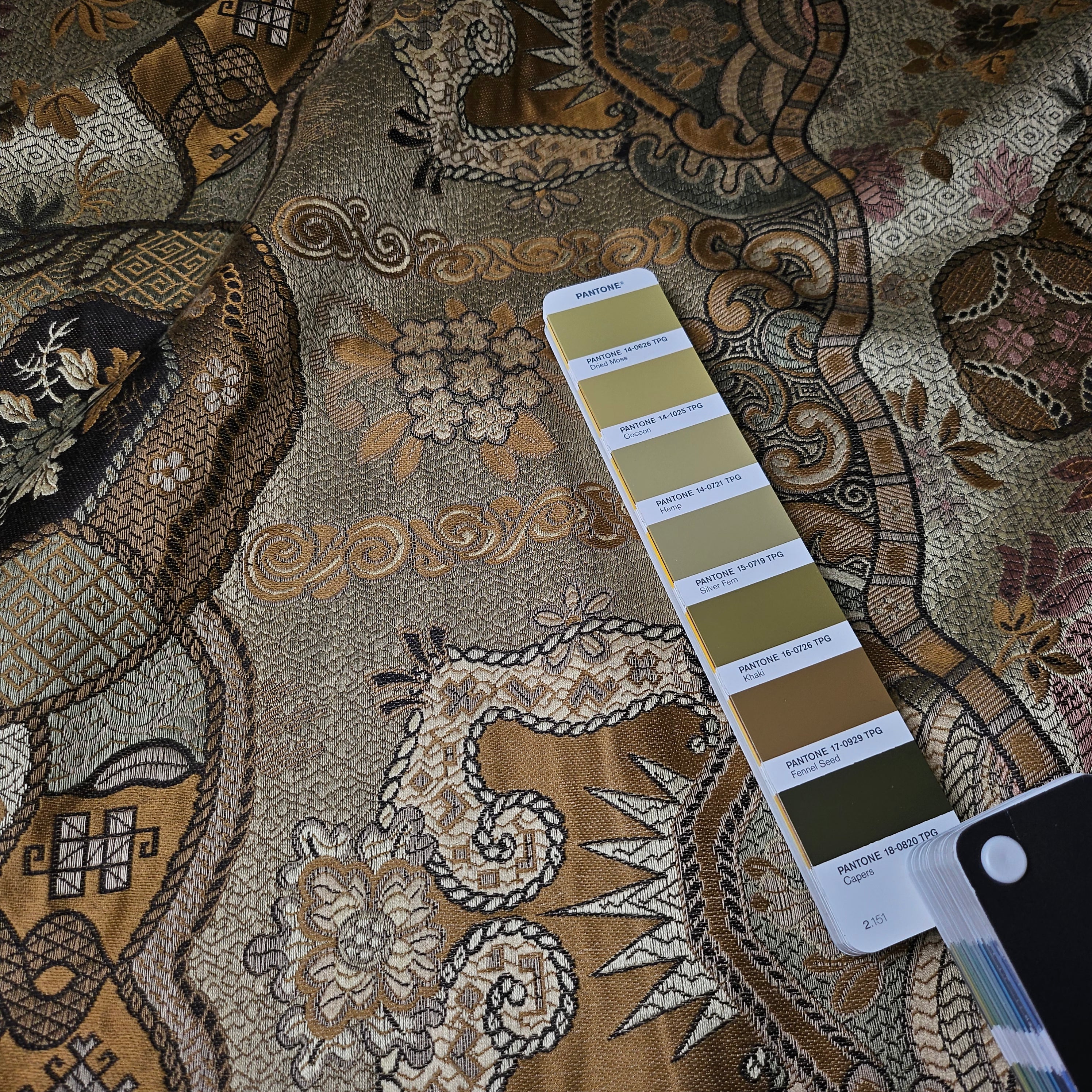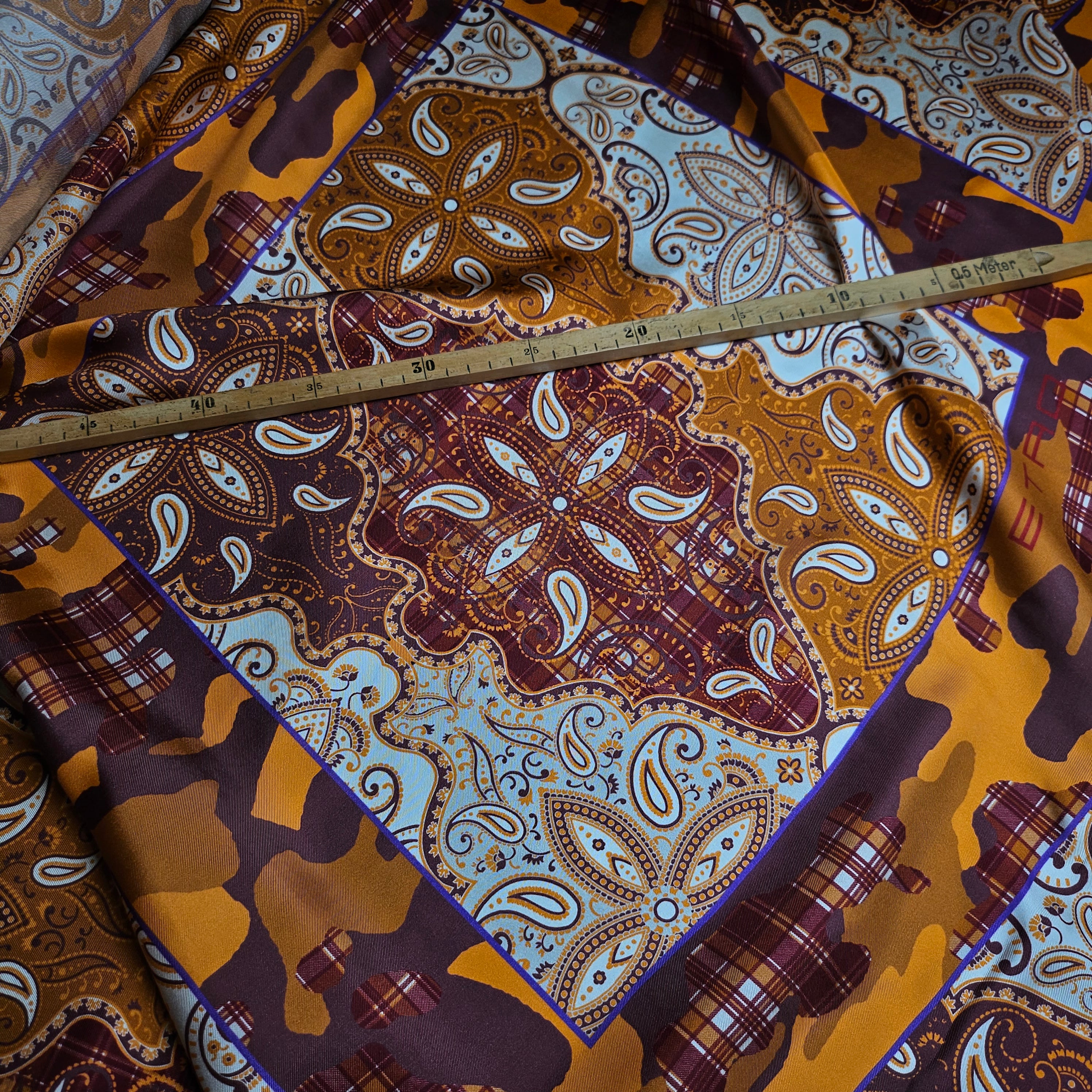 Etr* Designerstoff – Deadstock Lycra in Basisfarbe Pantone Gold Fusion mit Ornamentaufdruck | 140 cm | M6X1X24