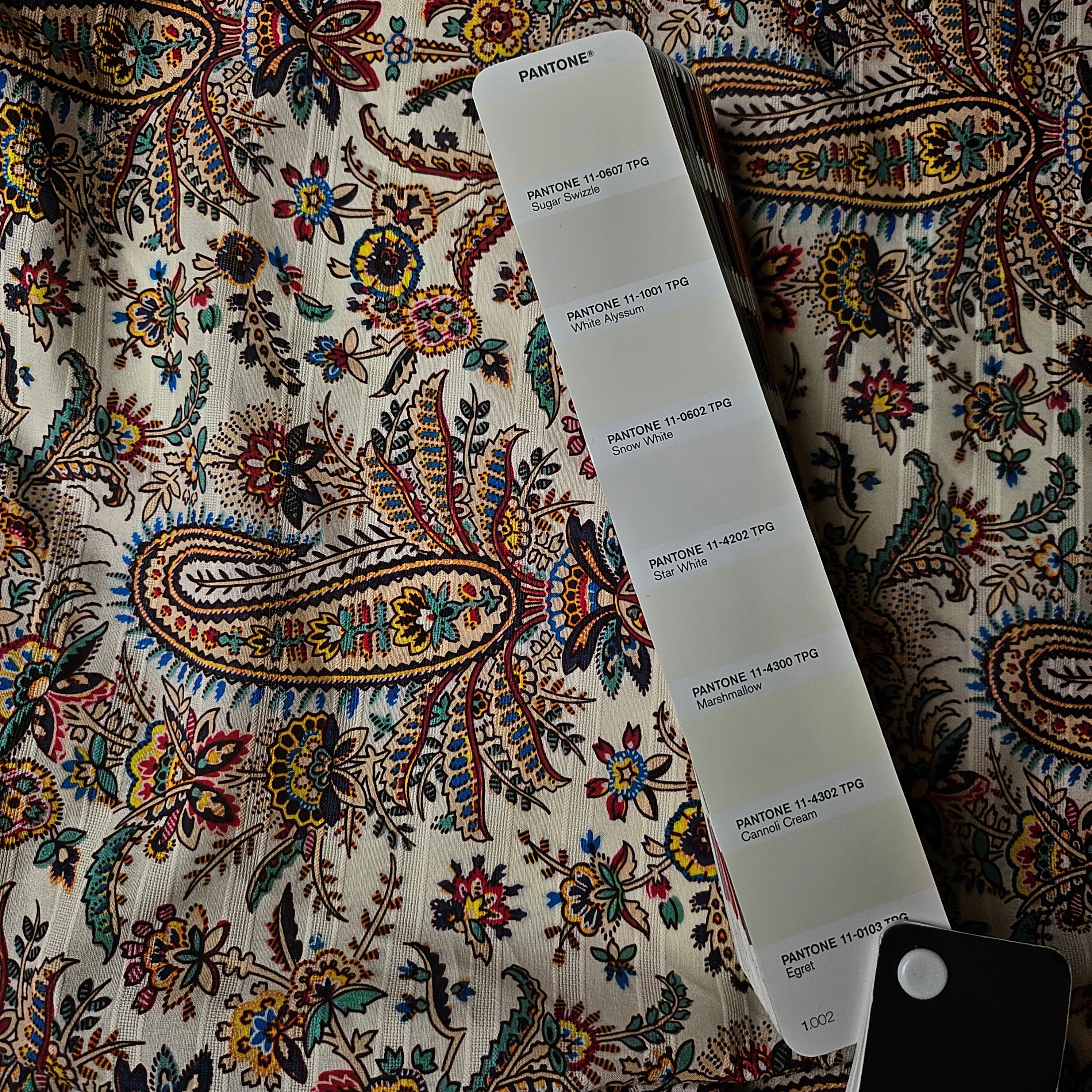 Etr* Designerstoff – Deadstock bedruckte Baumwolle mit eingewebten Streifen in Basisfarbe Pantone Sugar Swizzle | 150 cm | M5X3X12