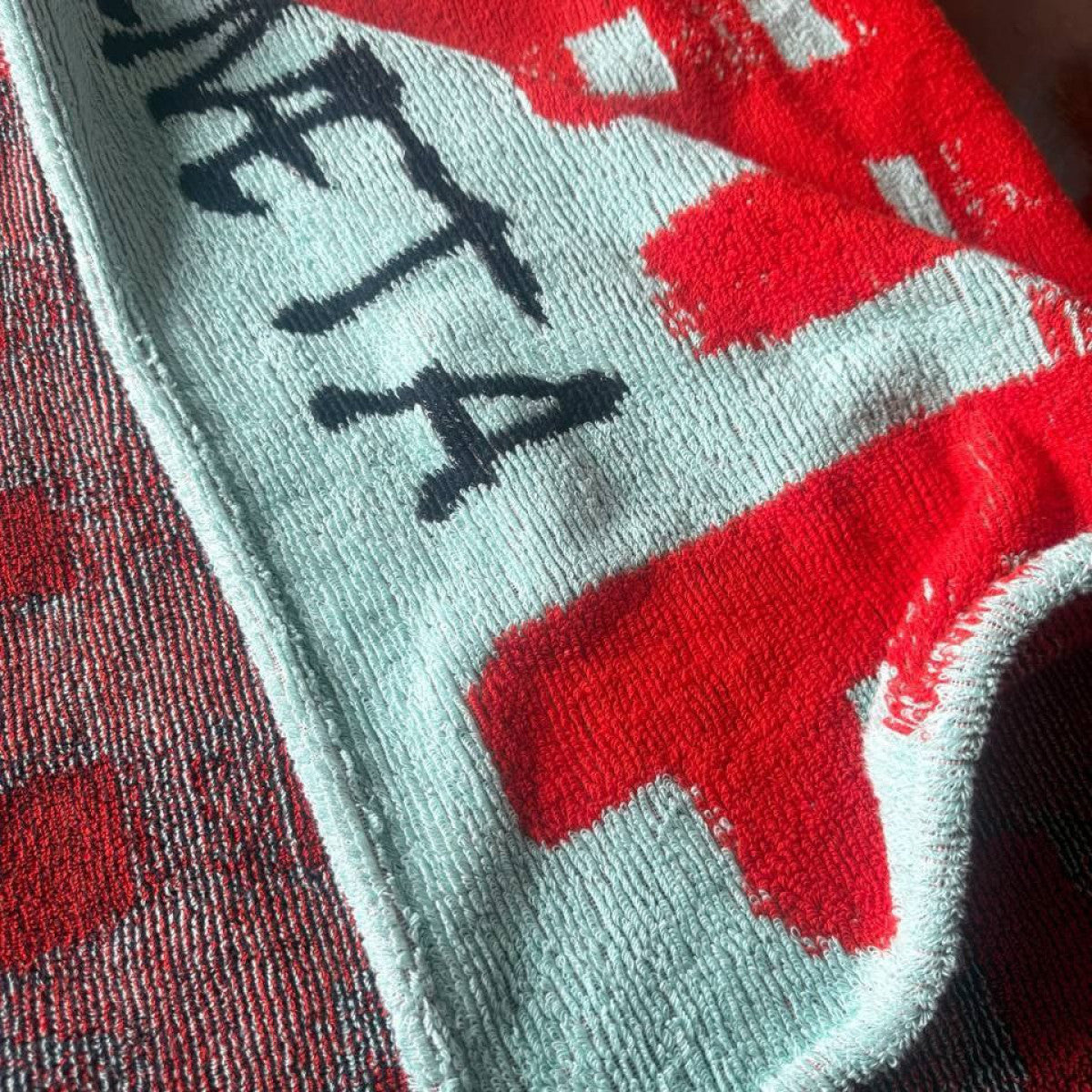 B########a V#####a Handtuch – hellblau/rot – leichte B-Ware | 105 cm x 180 cm