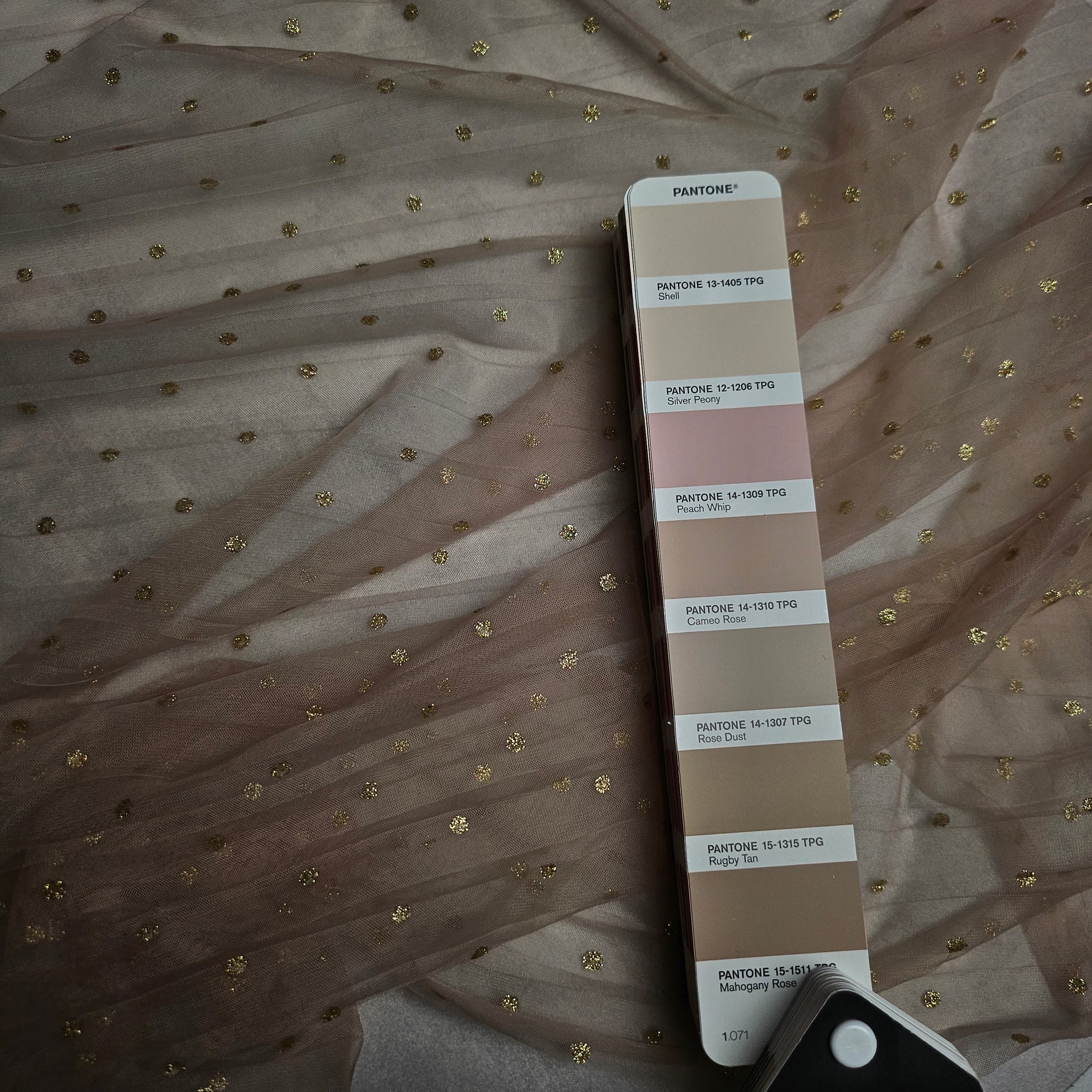 B######y Designerstoff – Deadstock Tüll Plissee Basisfarbe Cameo Rose mit Gold | Stoffbreite 150 cm | M8X5X3