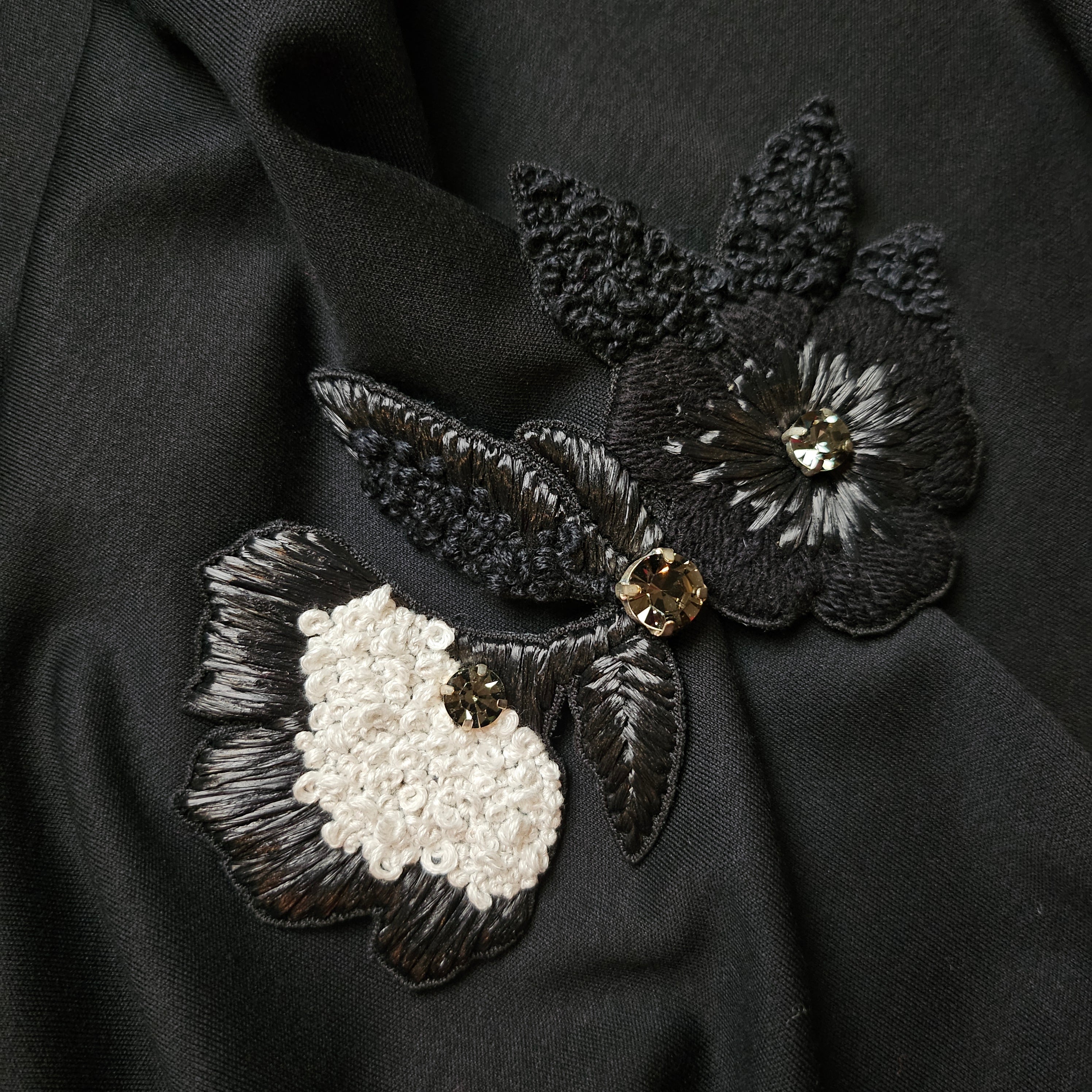L5X2X010 Patch 3D Stickerei Wolle, Raffia, Kristalle schwarz Weiß Blume 3d D&G 13cm X 8 cm