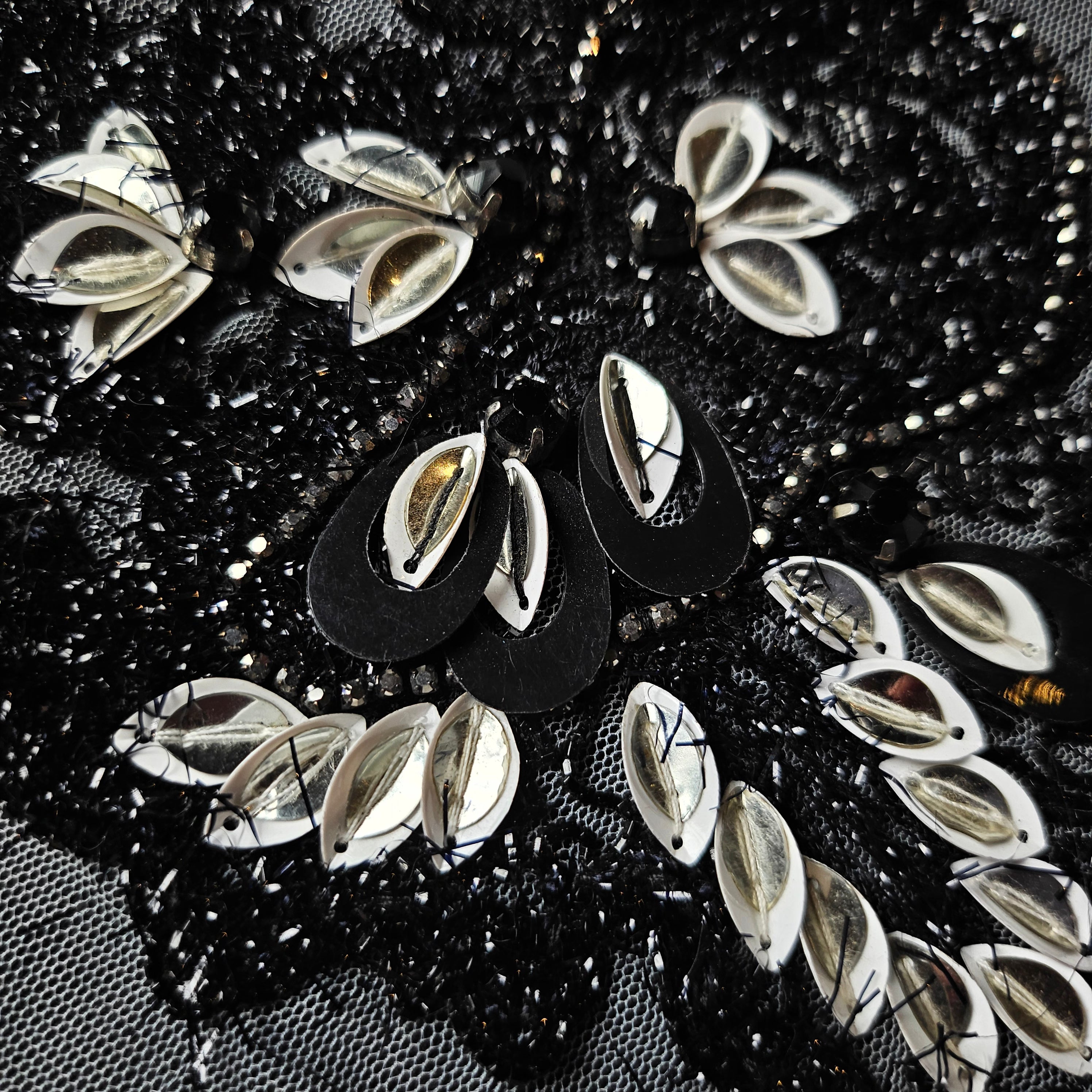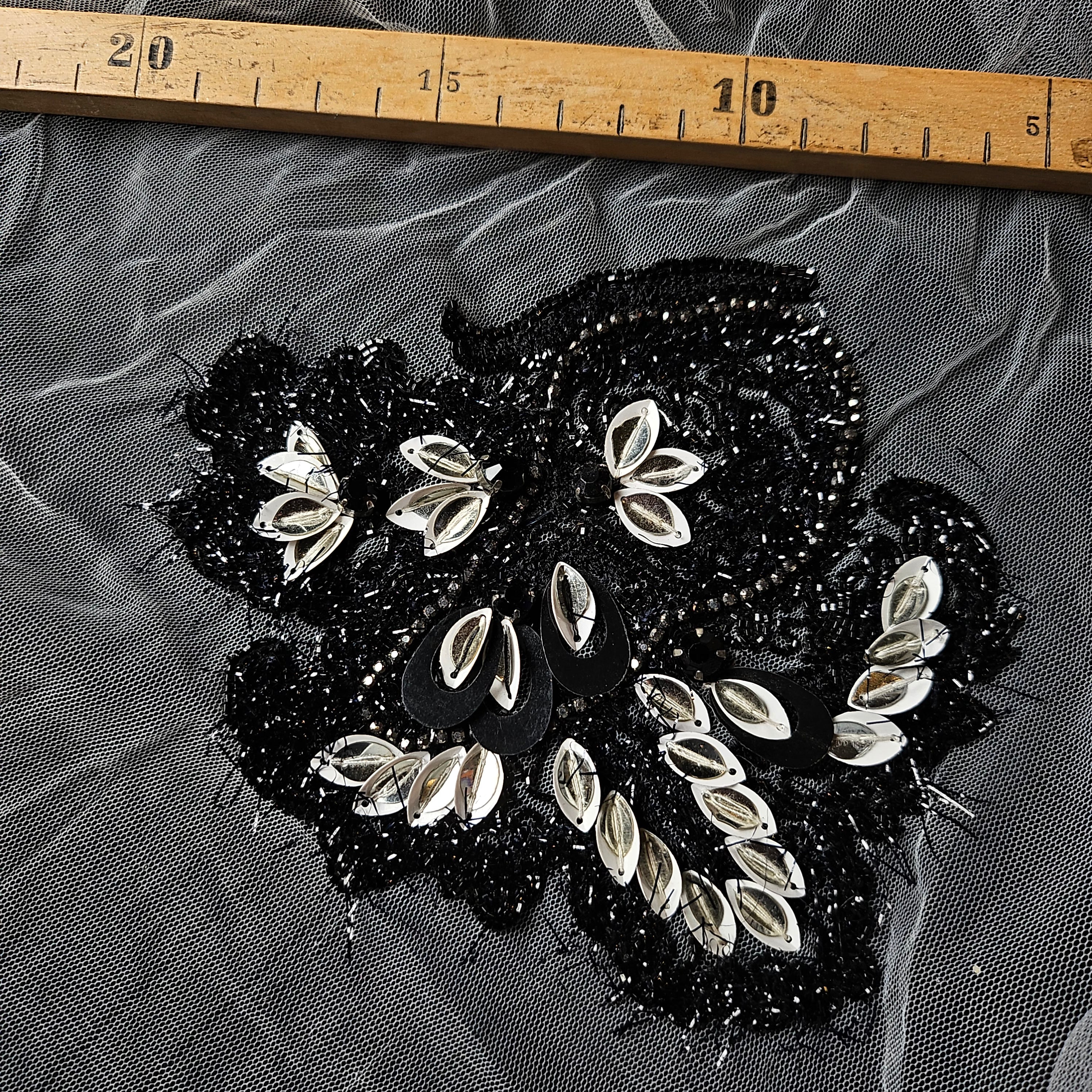 Patch Aufnäher D&G – Schwarzer Spitzenaufnäher mit Silbersteinchen, Pailletten und Perlen, Bestickt, 12x12,5 cm (S3X6X029)
