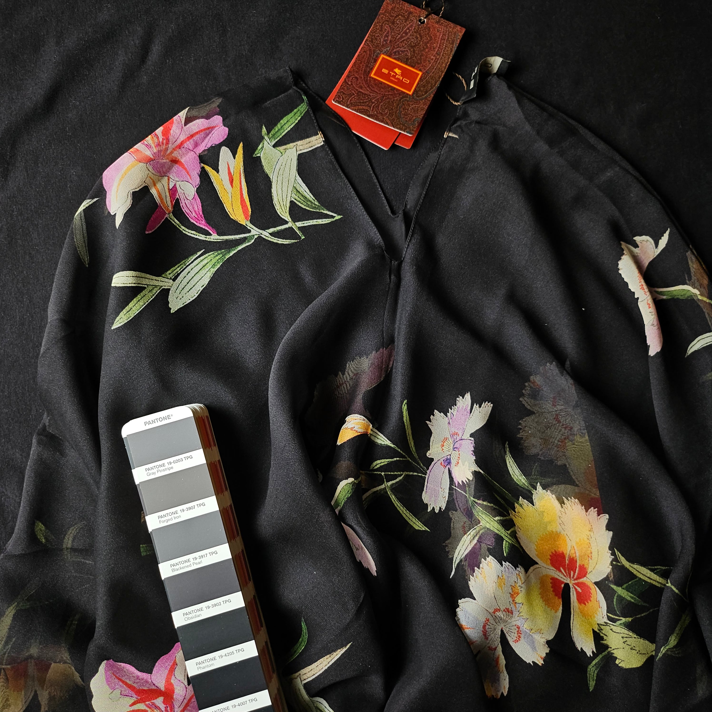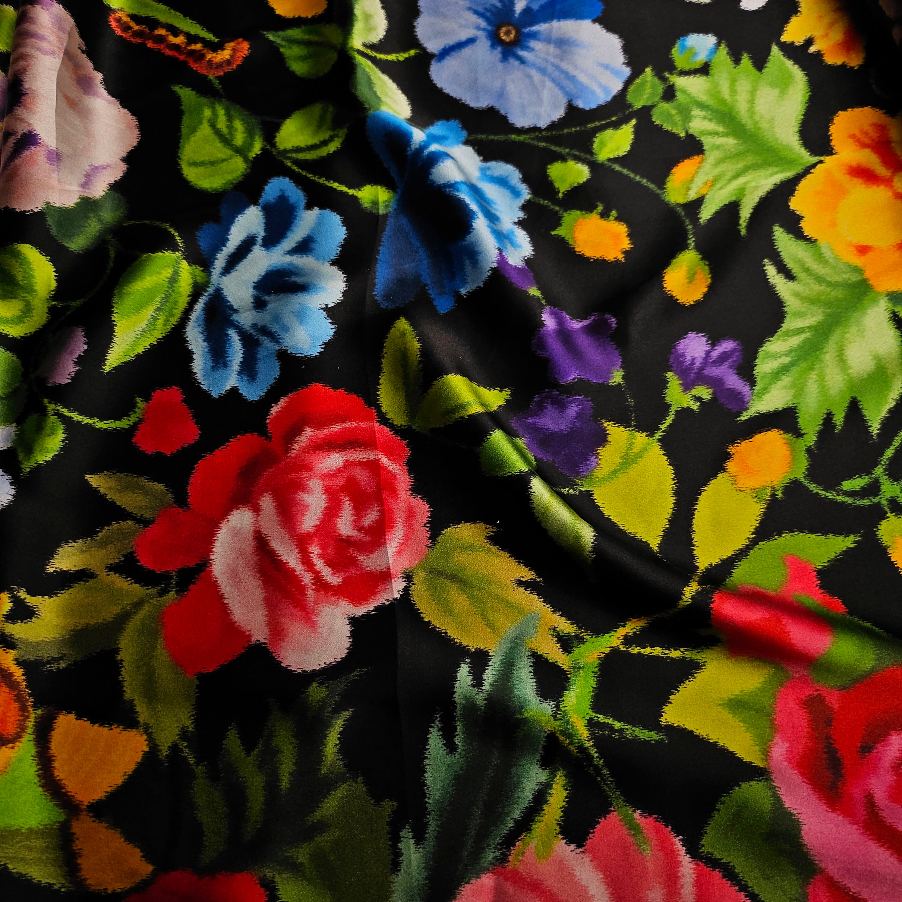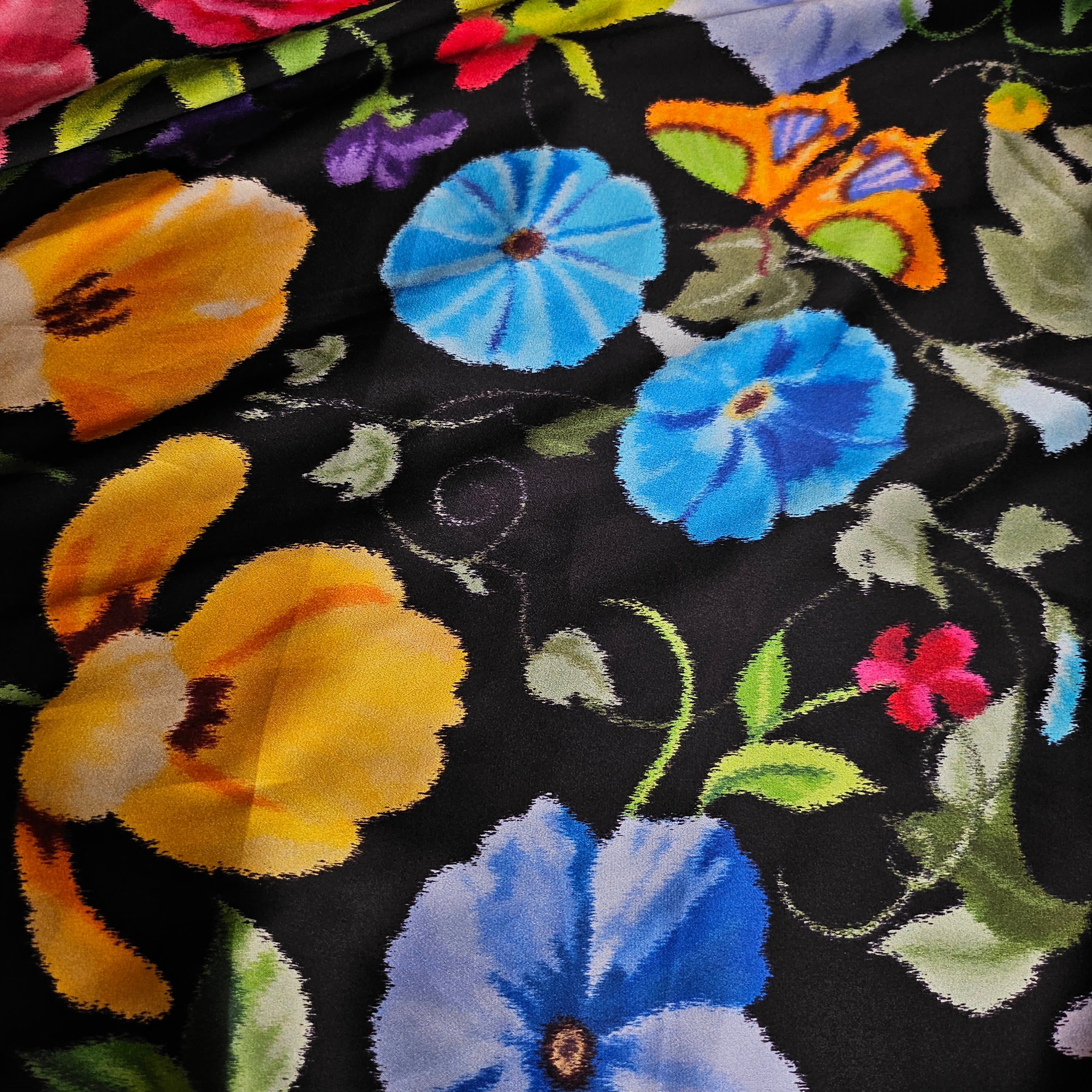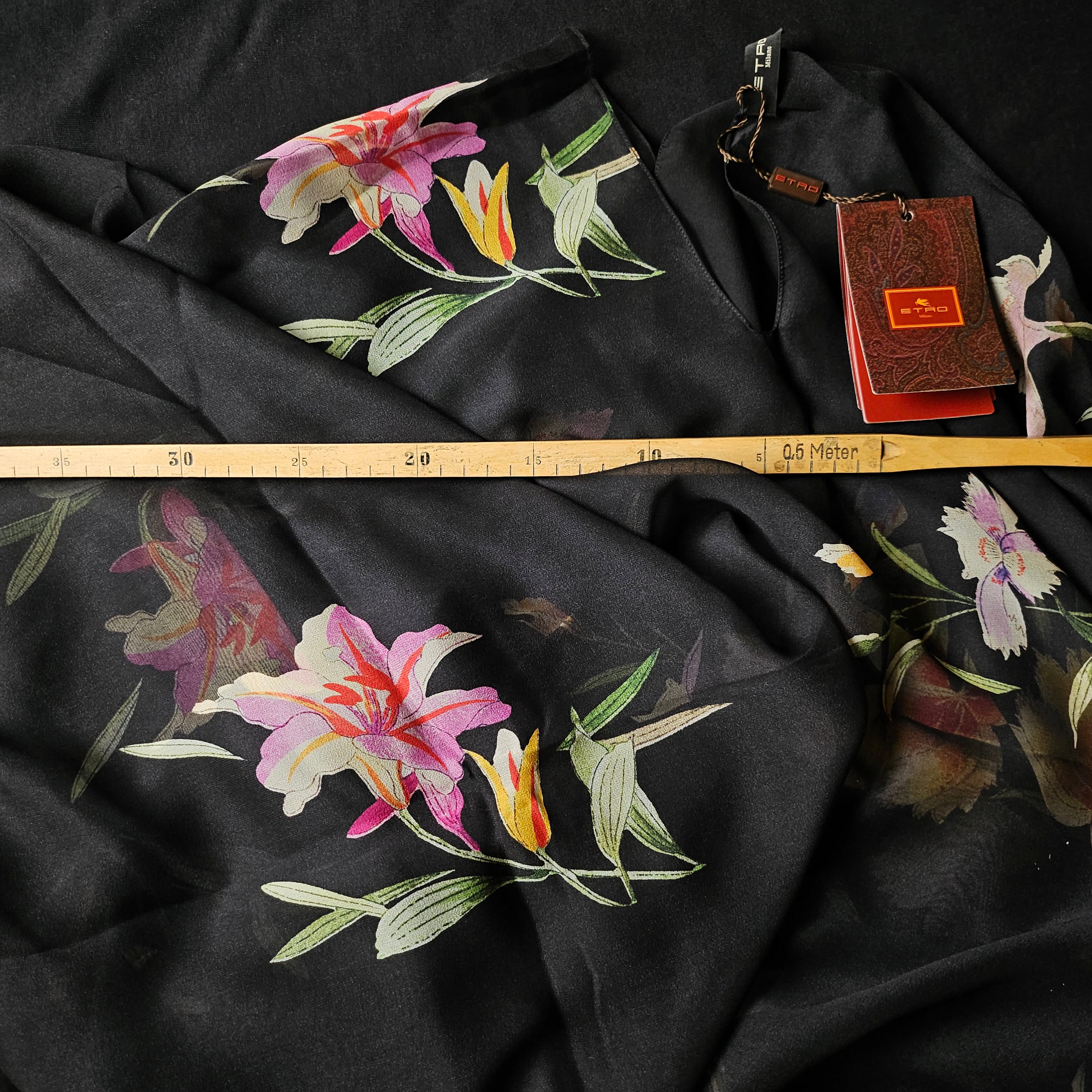Deadstock Seidenchiffon Poncho – Schwarz mit Blumenprint, Etr*o (Einzelstück, Maße 68 × 135 cm) (S10X1X32)